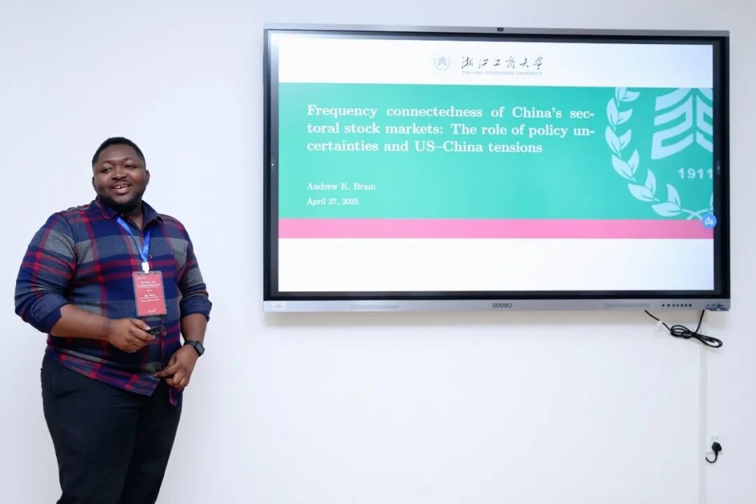 来自统计与数学学院的加纳籍博士生Andrew Kwamina Bram 分享学术报告Frequency connectedness of China’s sectoral stock markets: The role of policy uncertainties and US–China tensions