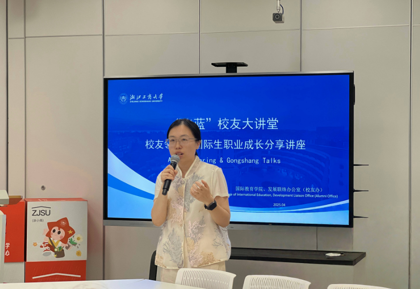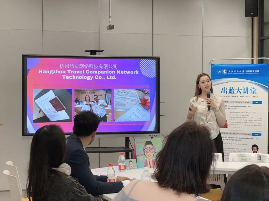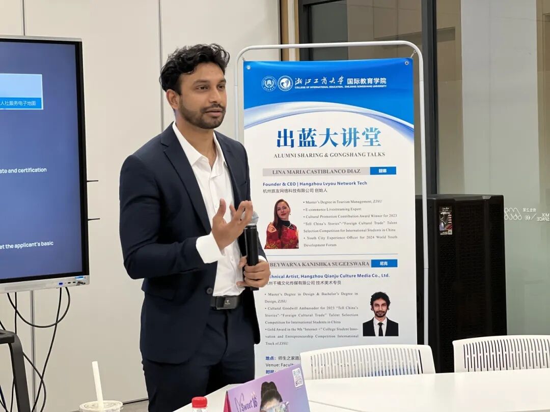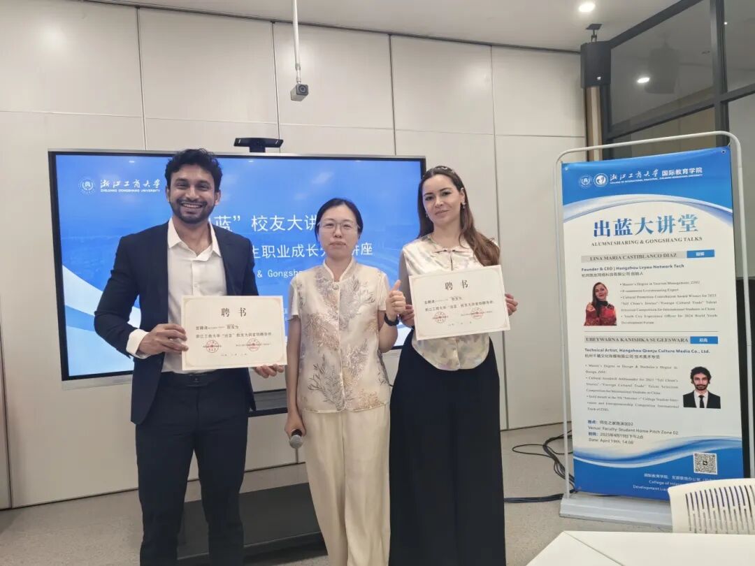 To help international students gain a deeper understanding of innovation, entrepreneurship opportunities, and career development pathways in China, the College of International Education hosted the“Chu Lan”Alumni Talk on April 19. Two distinguished alumni were invited back to campus to engage in face-to-face exchanges with current students and share their personal experiences of studying, working, and developing their careers in China. The guest speakers were Lina Maria Castiblanco Diaz (Colombian), founder of Hangzhou Lvyou Network Tech, and Ubayawarna Kanishka Sugeeswara (Sri Lankan), Technical Art Specialist at Hangzhou Qianju Culture. Drawing on their unique journeys, the two alumni delivered a highly practical and inspiring talk on professional development in China.