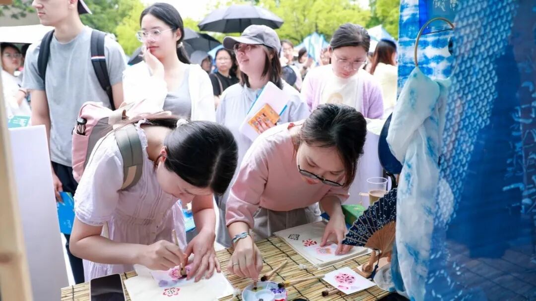 云滨社区和后勤服务中心精心打造的3个中国非遗文化体验展示区更是亮点纷呈。端午节特色摊位前,红绳编织、面塑泥人等传统手工艺品散发着浓郁的节日氛围,非遗扎染与手工漆扇体验区邀请到非遗传承人朱红芳与非遗文化讲师王欣展现场创作展示,蓝白相间的扎染作品在大家手中徐徐绽放,竹编风铃、螺钿等作品精巧绝伦,同学们在体验中触摸中国传统文化的温度。