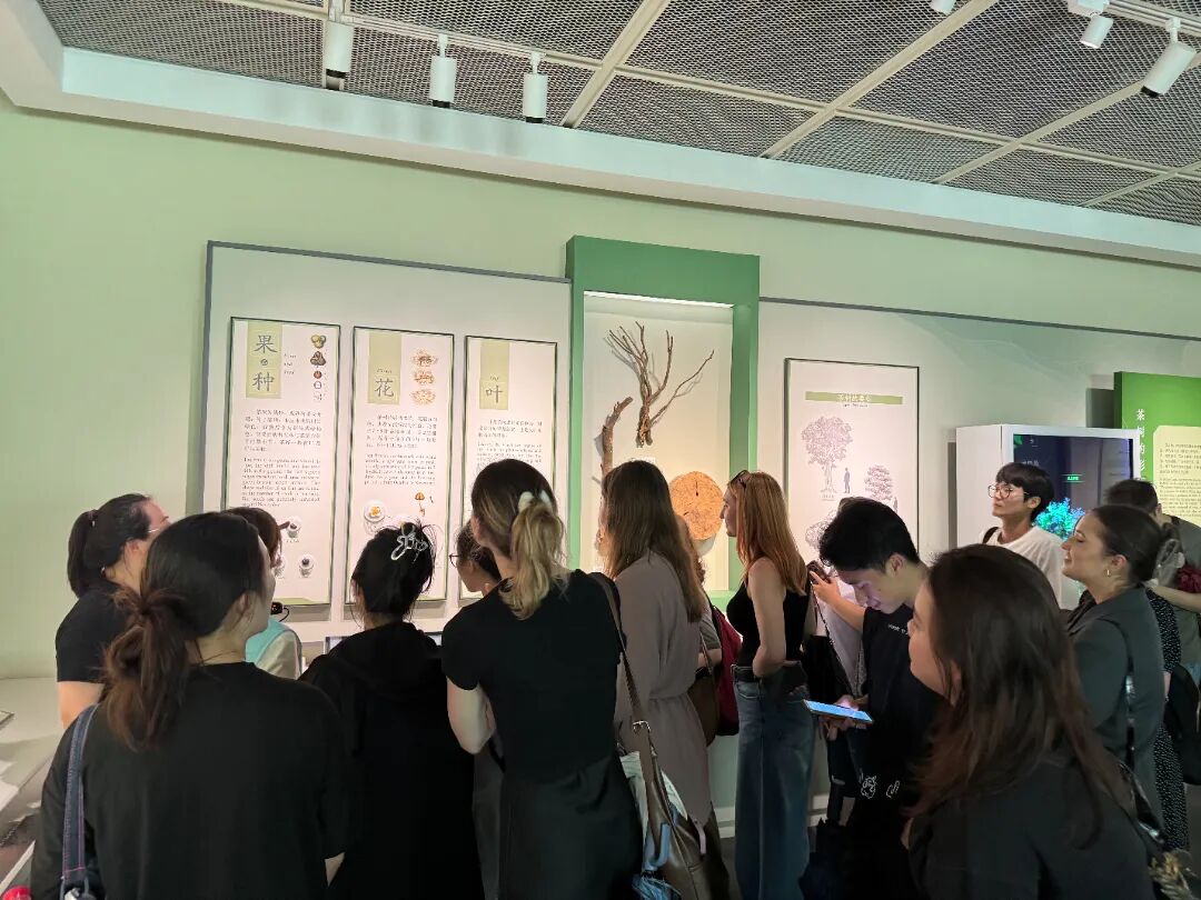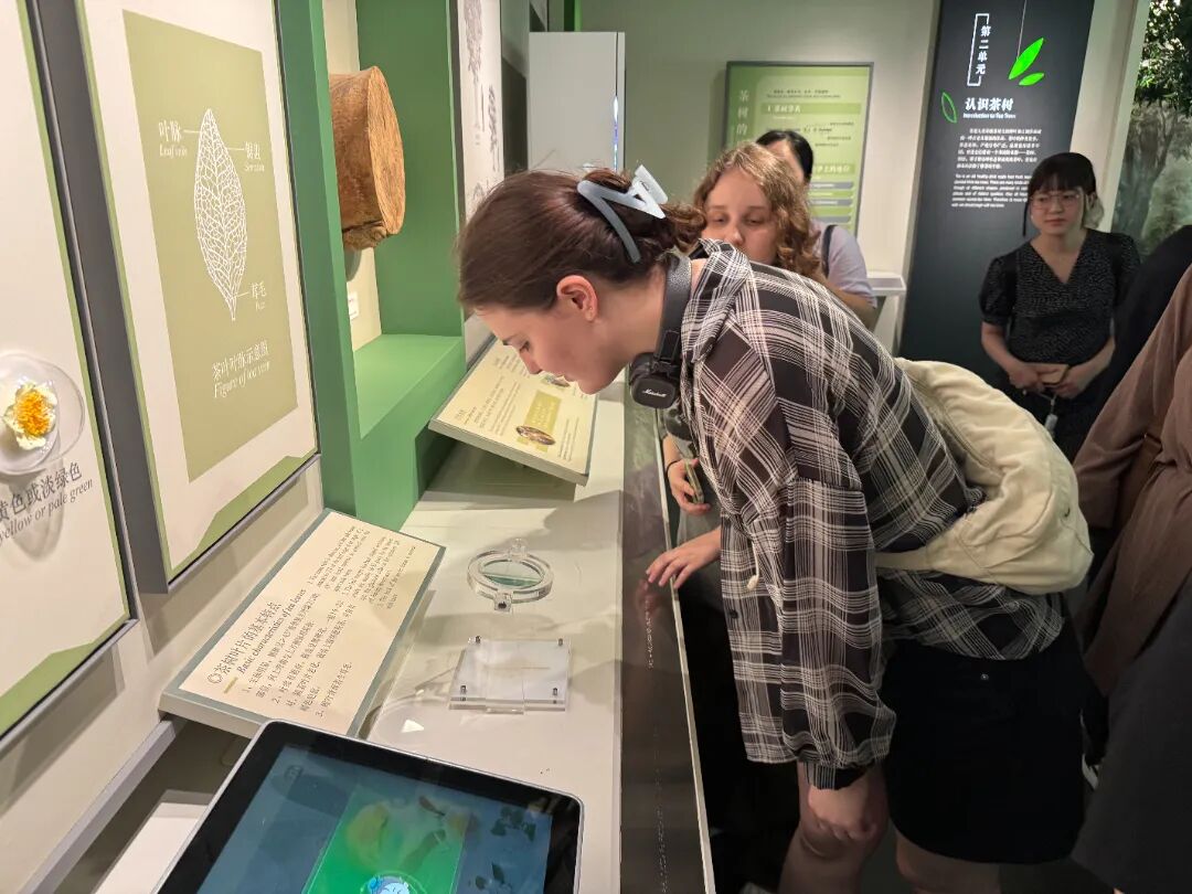 在博物馆工作人员的带领下,外国学生们开启了奇妙的茶文化学习之旅。双峰馆的每个展馆围绕一个主题,聚焦中国茶文化,让同学们沉浸式学习茶饮风俗。该馆身处江南园林之中,山环水绕,茶园风光让同学们陶醉。在馆内,同学们不仅能了解到绿茶、红茶、白茶、黄茶、青茶、黑茶等丰富的茶叶品类,还有成百上千种实际样品可供参考学习;从沏茶方法、存储方法,到茶叶制作的各式各样新型产品,都一一呈现在眼前。同时,由中国农业科学院茶叶研究所提供的数据来源,如茶叶香气轮盘、中国茶叶颜色轮盘、茶叶色泽类型等,更是让同学们对茶叶有了更专业、更全面的认识。此外,那些流传千年的茶叶在中国古代的历史故事,也让大家听得入迷,纷纷感叹原来茶的门道如此之多。在学习茶叶种植与分类时,同学们对黄茶这种少见的茶类产生了浓厚兴趣,得知其主要产自湖南君山银针茶园和温州平阳黄汤茶园。而工艺造型茶更是让大家大开眼界,原来茶叶还能有如此精美的造型。