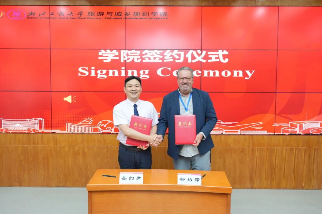 美国圣地亚哥州立大学罗伯特·佩恩旅游与酒店管理学院院长卡尔·温斯顿在致辞中,深情回顾了自己多次访华的美好经历,对杭州独特的人文魅力赞不绝口。他着重强调,教育合作是跨文化沟通的重要桥梁,能够促进不同国家青年之间的相互理解与友谊。随后,在全体与会人员的共同见证下,两院院长正式签署合作协议,全体人员合影留念。