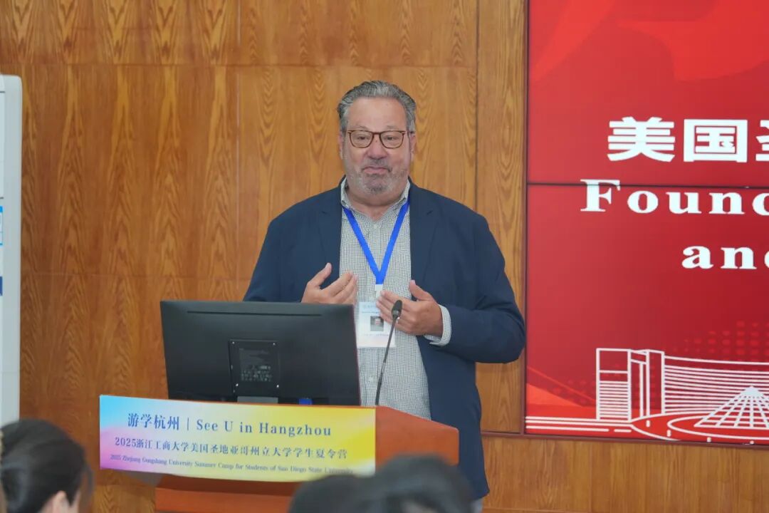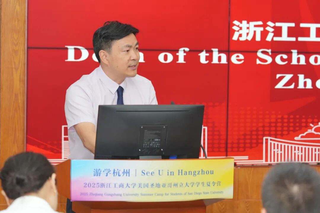 浙江工商大学旅游与城乡规划学院院长项国鹏致欢迎辞,他向远渡重洋而来的美国师生表示热烈欢迎,并详细介绍了学校及学院在学科建设、国际合作、人才培养等方面的显著成果。项国鹏表示,希望以此次夏令营为重要契机,进一步推动两校在教育与文化领域的深层次融合,为双方的长期合作奠定更坚实的基础。